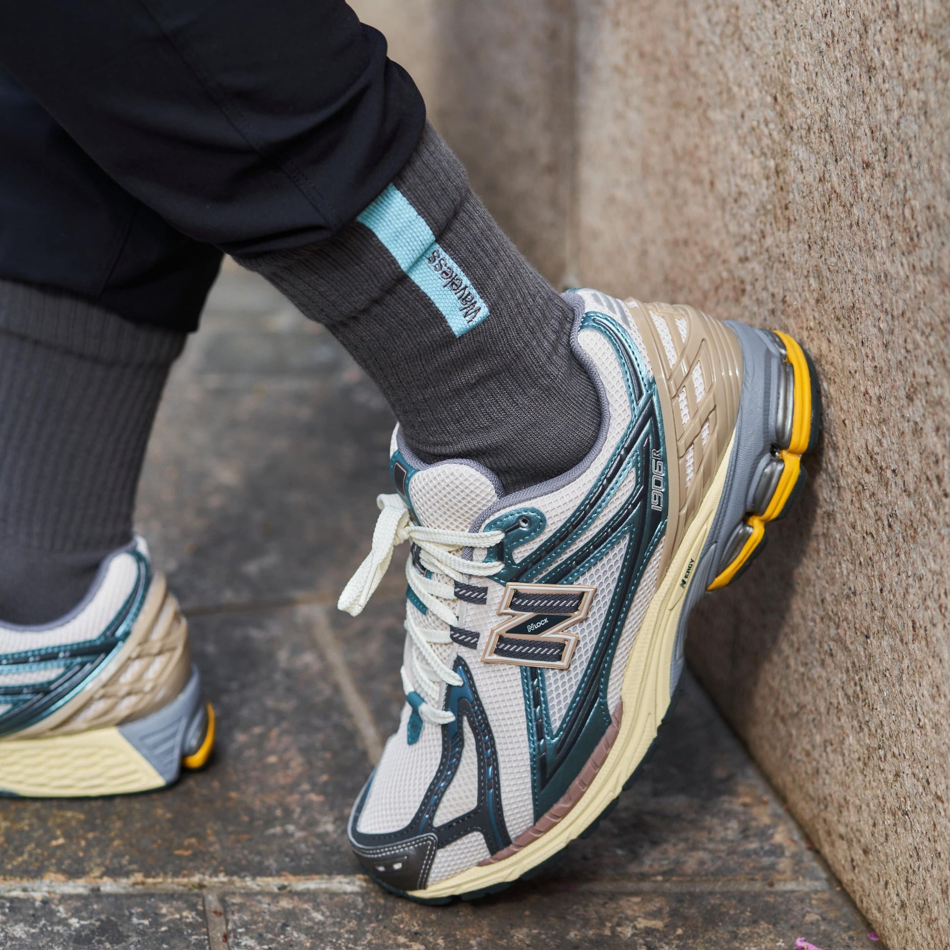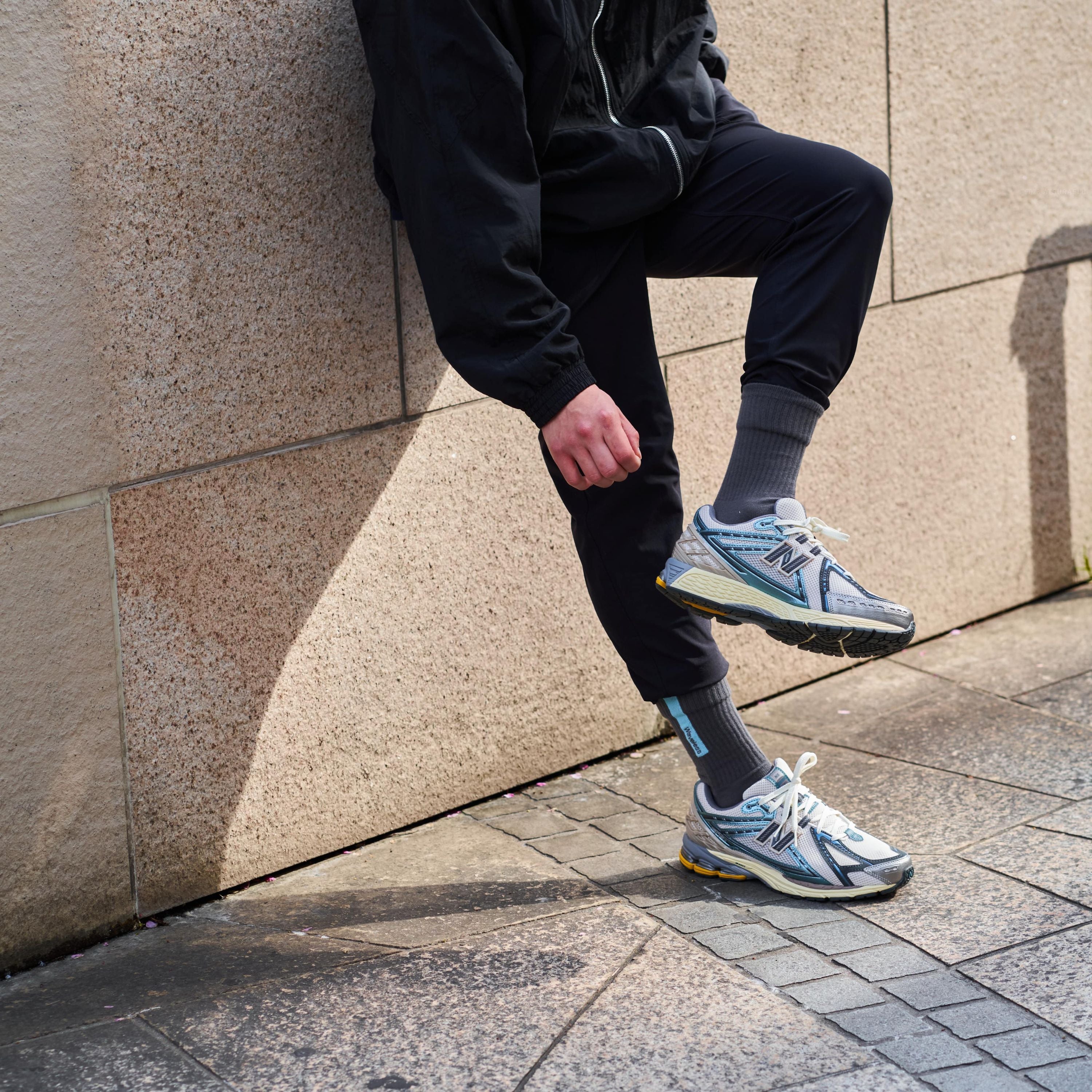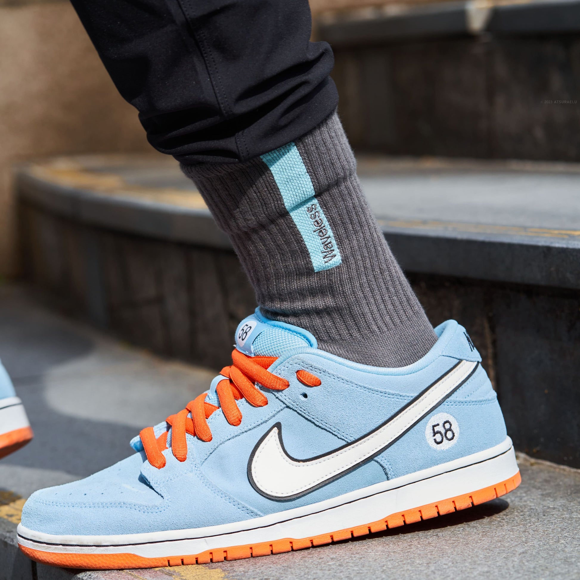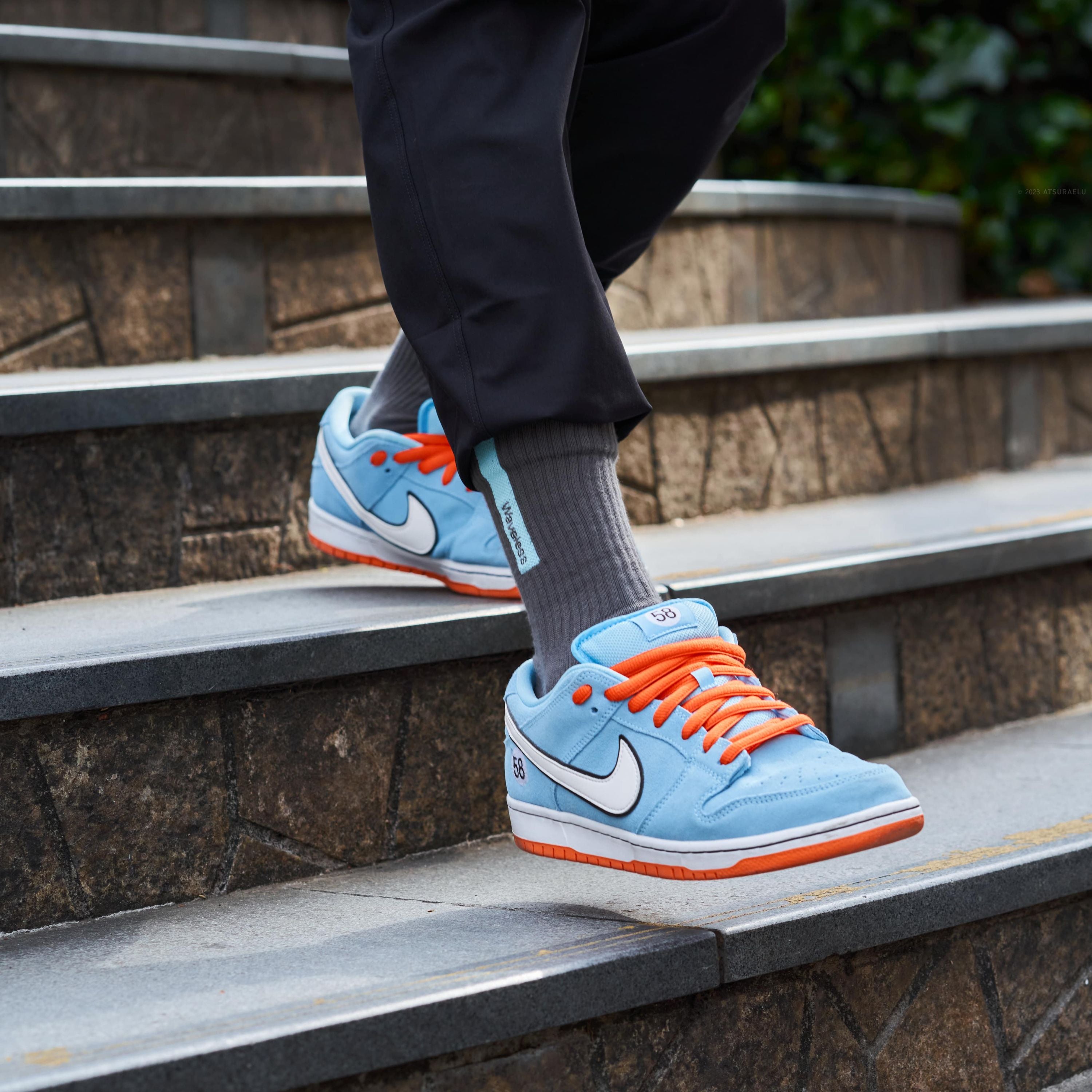 またデザインとして多くはありませんが水色のスニーカー(差し色でも可)を持っているようであれば、そのスニーカーと合わせても面白い一足だと思います。