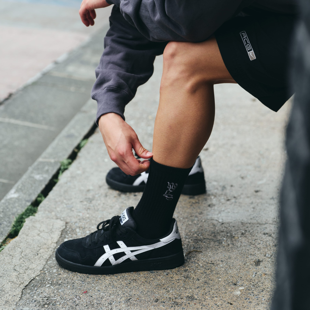 ハイカットのスニーカーからロゴを覗かせるのもカッコ良いのでハイカットスニーカー好きの方にもおすすめです。